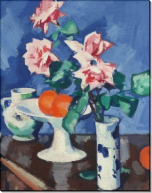 Розовые розы в сине-белой вазе с апельсинами и кувшин. Пепло, Самуэль Джон